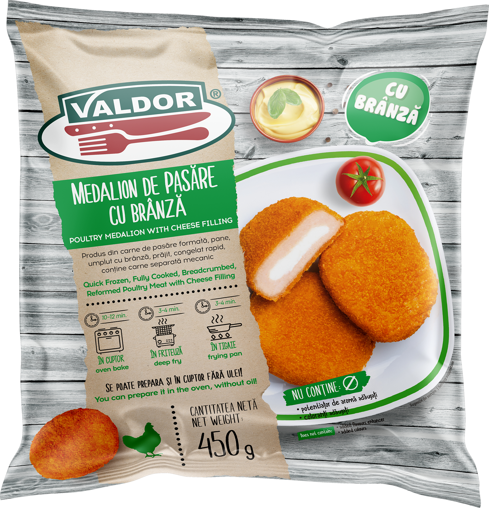 – Conținut de 28% carne de pasăre – Umplutură cu 10% brânză procesată